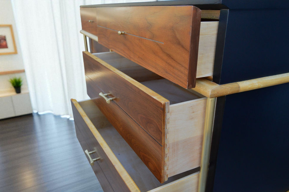 The dresser features 6 gliding drawers and is crafted from oak and walnut. The oak details provide a nice counter balance which I chose to keep natural as it frames and complements the walnut drawers nicely. It has brass handles and two brass post which provide a unique yet striking finishing touch, creating a versatile piece that balances vintage warmth with contemporary flair, perfect for any bedroom.