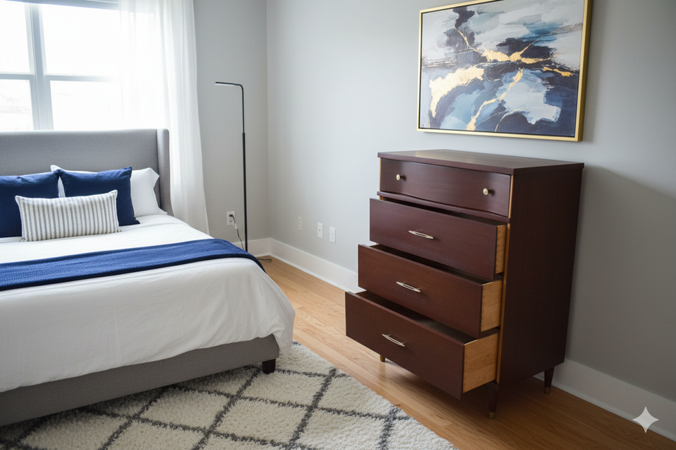 Crafted with a rich walnut finish, this dresser showcases the iconic clean lines and minimalist aesthetic that define mid-century design. Its contoured top drawer accented with sleek brass pulls, create a striking visual contrast, while the sturdy wood construction ensures durability.